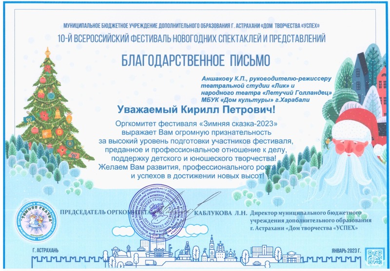 Новый 2023 год начался с новыми победами театральной студии «Лик» и Народного театра «Летучий голландец» МБУК «Дома культуры г. Харабали», участвовавших в 10-м Всероссийском фестивале новогодних спектаклей и представлений «Зимняя сказка-2023» на базе МБУДО г. Астрахани «ДТ «Успех».