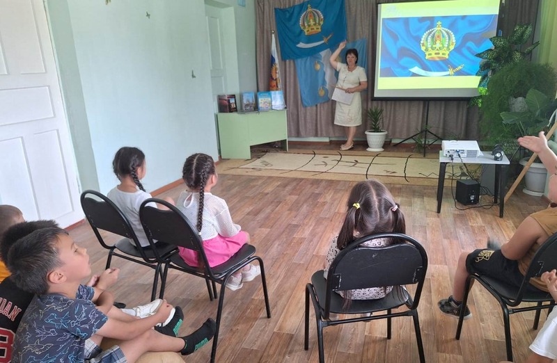 Ребята виртуально познакомились с историей, флорой и фауной края. Поговорили о том, какая большая страна Россия, вспомнили государственные символы страны и рассмотрели флаг Астраханской области и флаг села Сасыколи, которые также присутствовали на мероприятии в своем оригинальном виде.